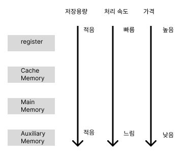 데이터나 프로그램을 보관하기 위한 일차 기억 장치인 주 기억 장치(Memory)와 주 기억 장치를 보조하기 위한 디스크와 씨디 같은 보조 기억 장치가 존재