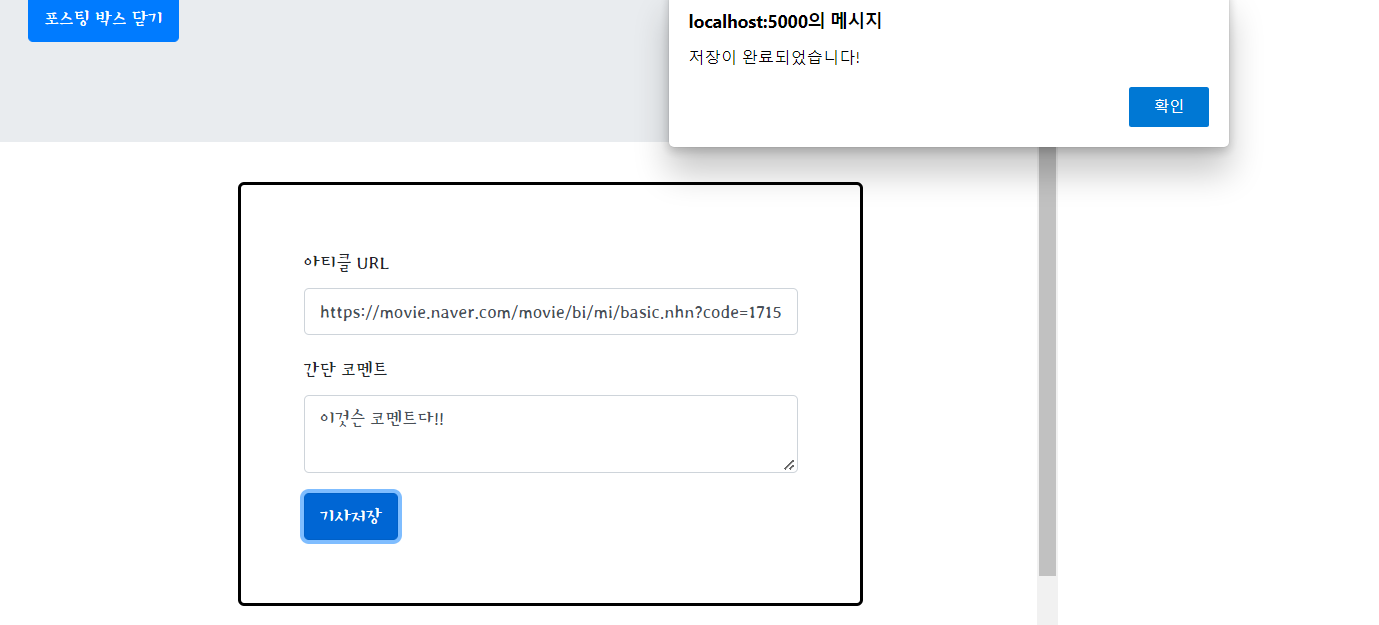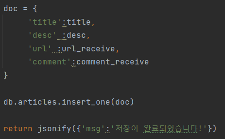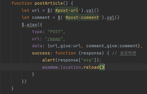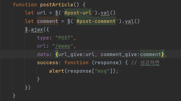- 요청 데이터 : URL(url_give), 코멘트(comment_give)