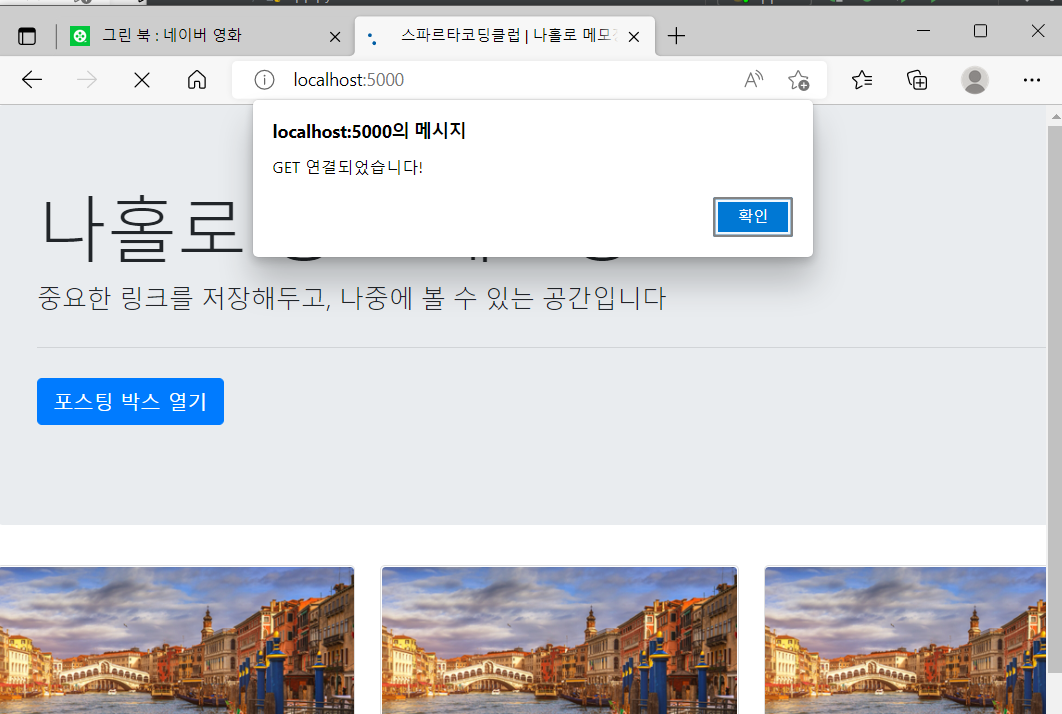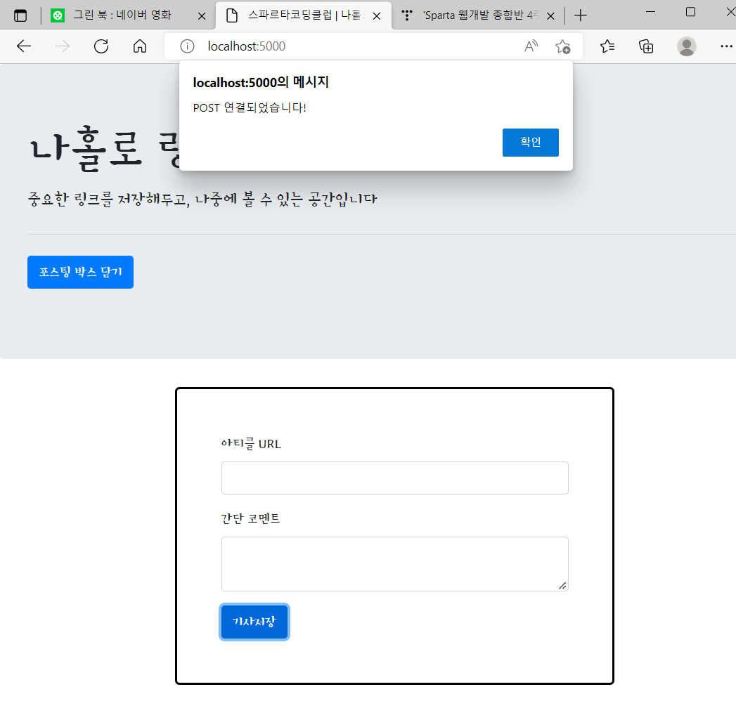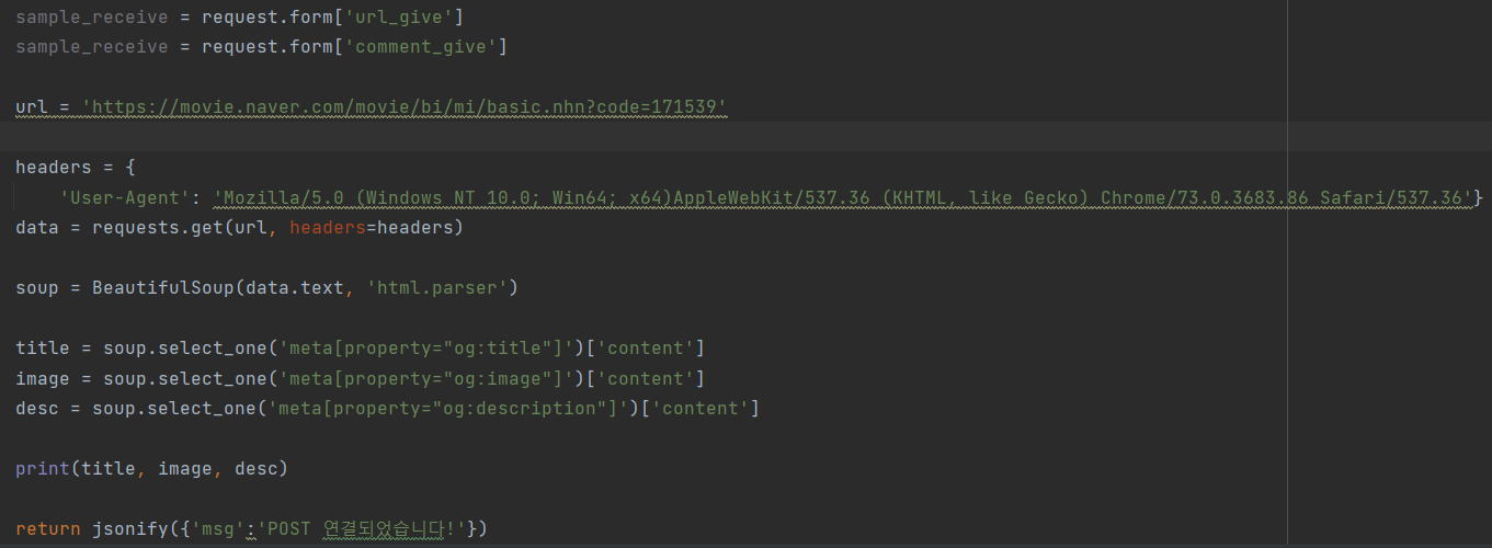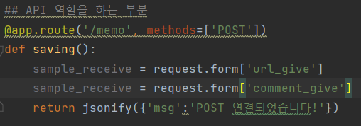 return jsonify({'msg':'POST 연결되었습니다!'}) #index.html에 있는 msg에 내려감