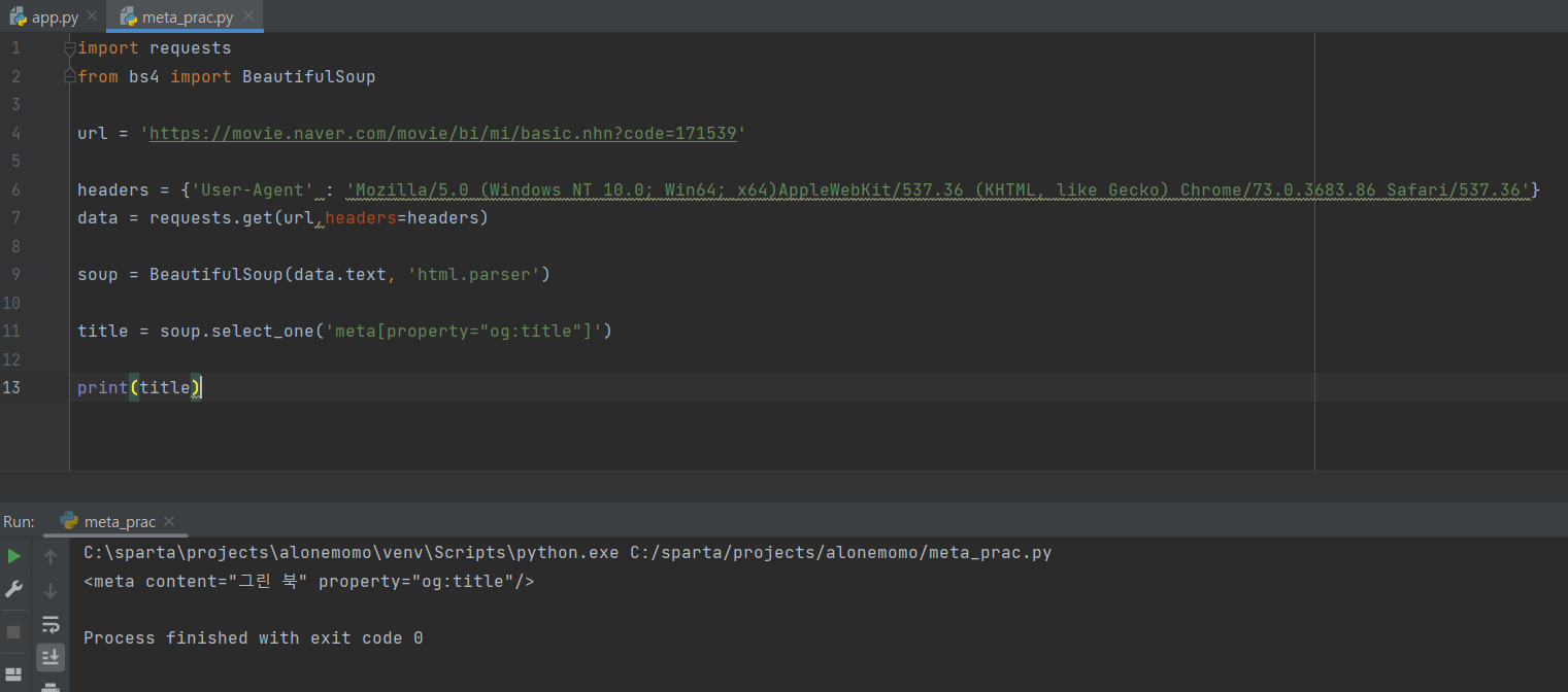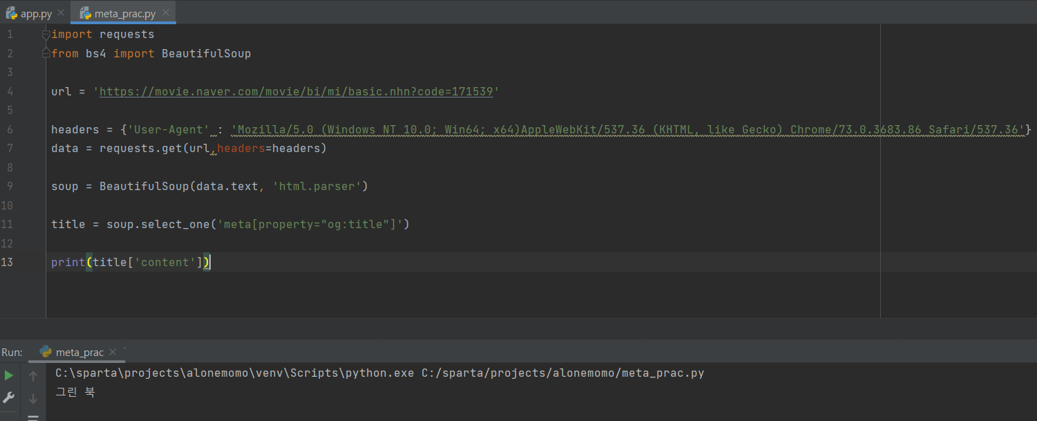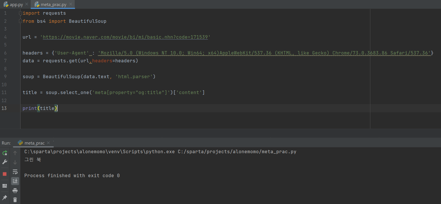라이브러리 설치 flask , pymongo, requests(크롤링할때 사용),bs4(beautifulsoup)