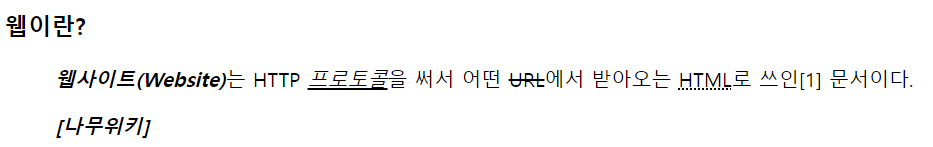 <p><strong><em>웹사이트(Website)</em></strong>는 HTTP <i><u>프로토콜</u></i>을 써서 어떤 <s>URL</s>에서 받아오는 텍스트굵게/텍스트 기울임 텍스트기울임/텍스트밑줄 텍스트취소선