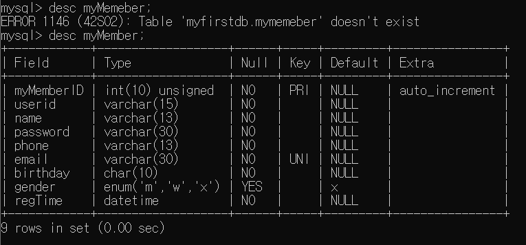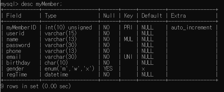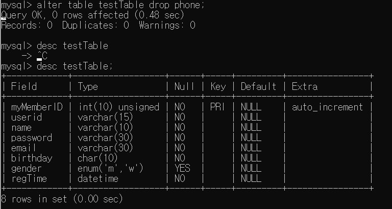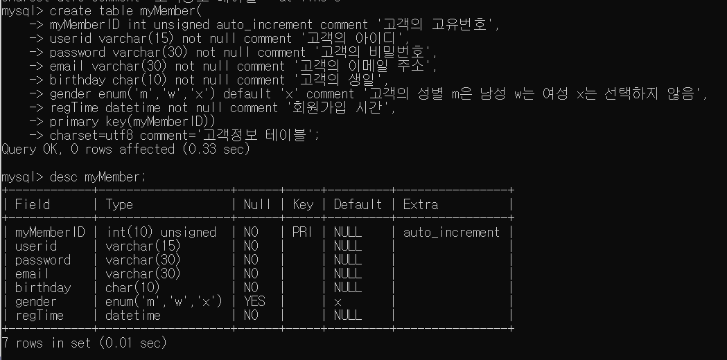 alter table testtable add gender enum('m','w','x') default 'x' comment '고객성별 - m은 남성 w는 여성 x는 선택안함' after birthday