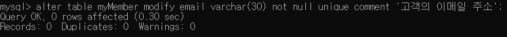 alter table 테이블명 modify 변경할 필드명 옵션 코멘트 위치