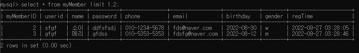 select 필드명 from 테이블명 limit 불러올 레코드 순번 ,불러올 개수