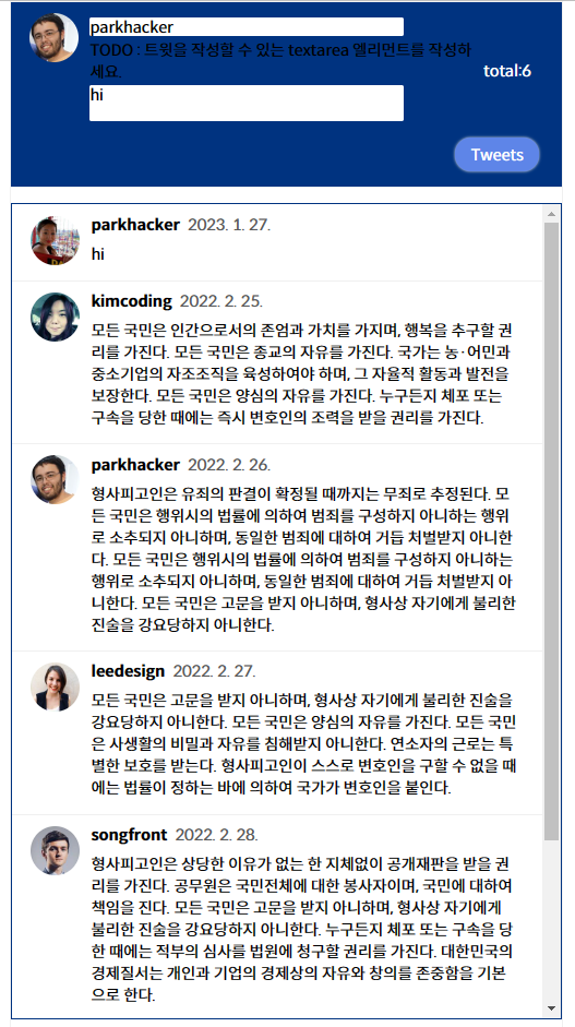 };//트윗 전송 버튼을 눌렀을 때 트윗 객체를 생성하고 tweets 배열에 추가하여 화면을 업데이트 하는 기능