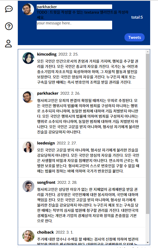 // TODO : 주어진 트윗 목록(dummyTweets)중 현재 유져인 parkhacker의 트윗만 보여줘야 합니다.